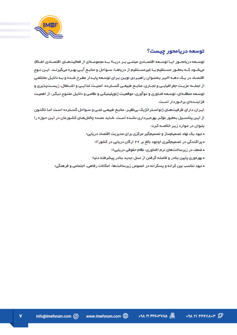 توسعه دریامحور (یا اقتصاد مبتنی بر دریا) به مجموعه‌ای از فعالیت‌های اقتصادی اطلاق می‌شود که به‌طور مستقیم یا غیرمستقیم از دریاها، سواحل و منابع آبی بهره می‌گیرند. این نوع اقتصاد در دهه‌های اخیر به‌عنوان یک راهبرد نوین برای توسعه پایدار مطرح شده و به دلایل مختلفی از جمله؛ مزیت جغرافیایی و تجاری، منابع طبیعی گسترده، امنیت غذایی و اشتغال، زیست‌پذیری و توسعه منطقه‌ای، توسعه فناوری و نوآوری، موقعیت ژئوپلیتیکی و نظامی و دلایل متنوع دیگر، از اهمیت فزاینده‌ای برخوردار است.